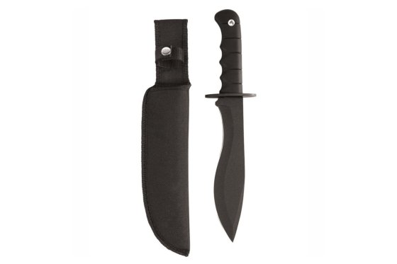 Veľký armádny nôž v tvare mačety s čiernou oceľovou čepeľou s hladkým ostrím a profilovanou rukoväťou potiahnutou čiernou gumou.